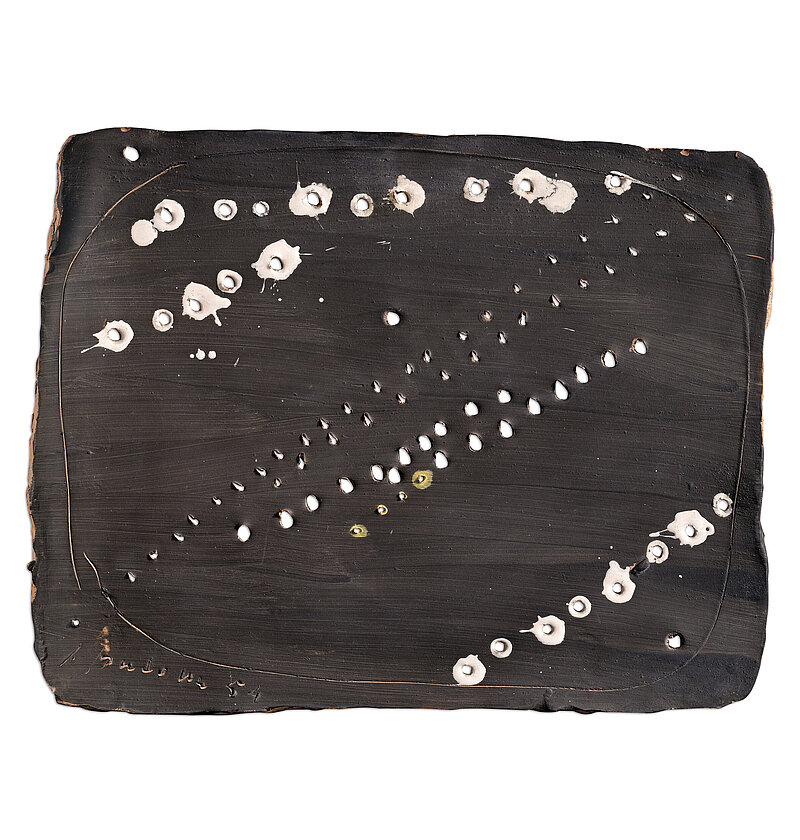 Fontana sought to free himself from the spatial framework through agitated movements, fragmented and luminous surfaces and a Baroque-Expressionist gesture set in an alternation of concave and convex shapes. Directly modulating the material with his spontaneous movements, Fontana highlights the softness and versatility of the material being handled. The matter seems to sizzle, becoming very agitated and telluric, though capable of palpable pleasure. Fontana is oriented in the direction of sculptural research that sees shape as an event through light and space, charging the clay with vital energy. In his works, Fontana ceaselessly confronts the techniques and traditional themes that are characteristic of ceramics. He fills his work with landscapes, religious scenes, vegetal and animal subjects and even characters from the Commedia dell’Arte, in order to reinvent them and launch into avant-garde ideas and achievements, the results of which are his famous works Concetti Spaziali, Buchi (since 1949) and Tagli (since 1958).