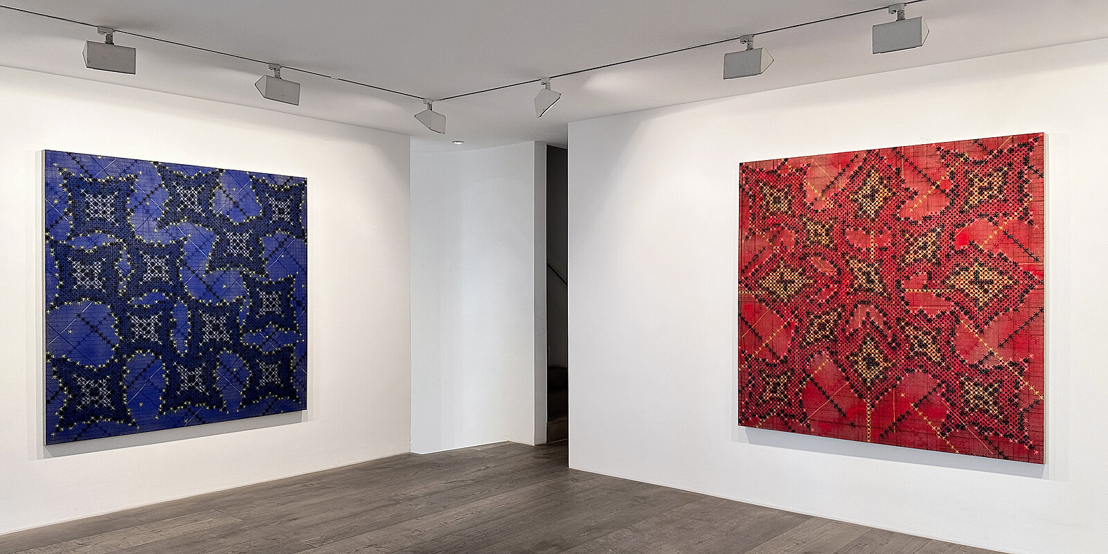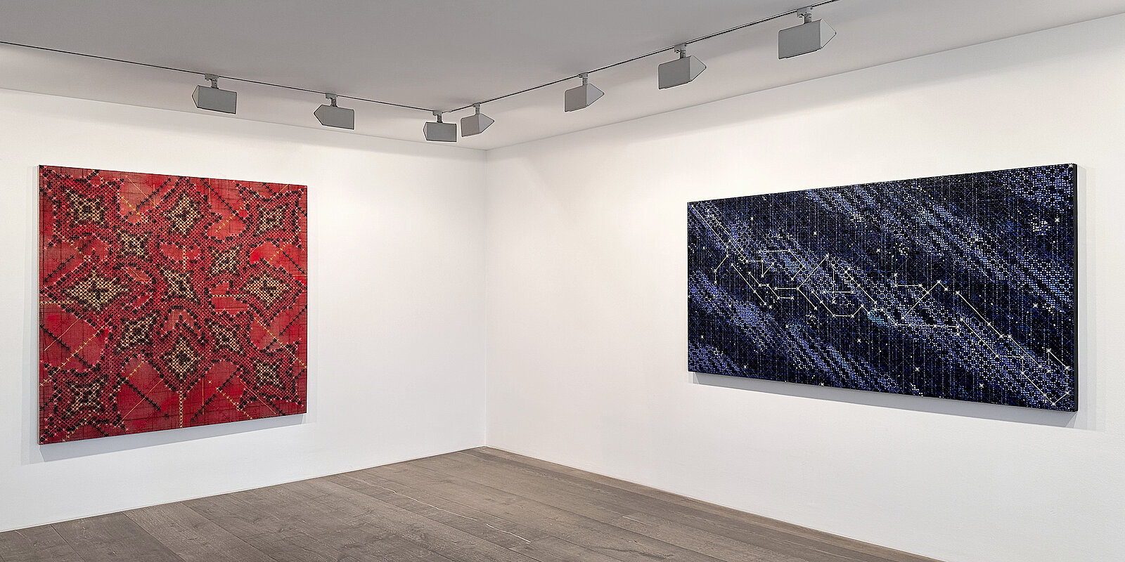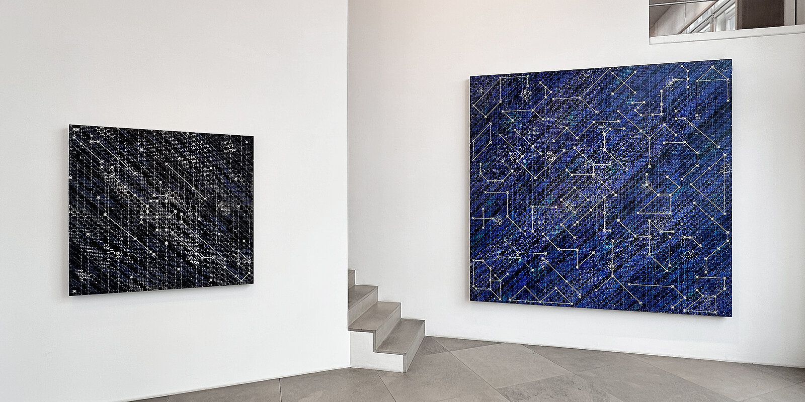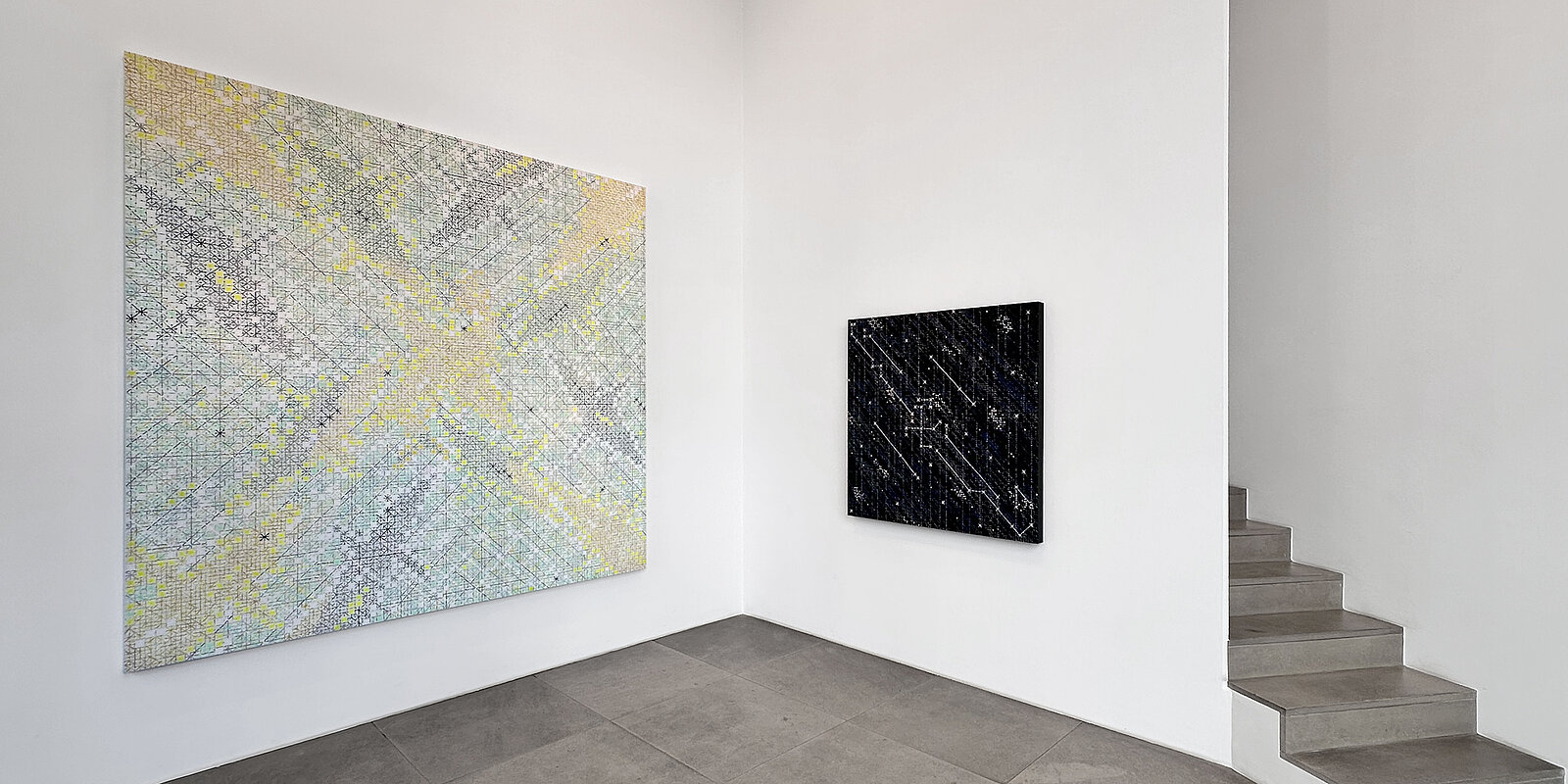 In line with his previous œuvre, the exhibited works reflect Ding Yi’s ongoing engagement with systems of order, visual language, and the aesthetic autonomy of the sign. In more recent works, the star emerges as a new element: the previously dominant cross and plus signs evolve into so-called “cross-stellations” – formations reminiscent of both celestial constellations and the vertical structures of modern metropolises. The resulting compositions resemble visual maps oscillating between science and transcendence.