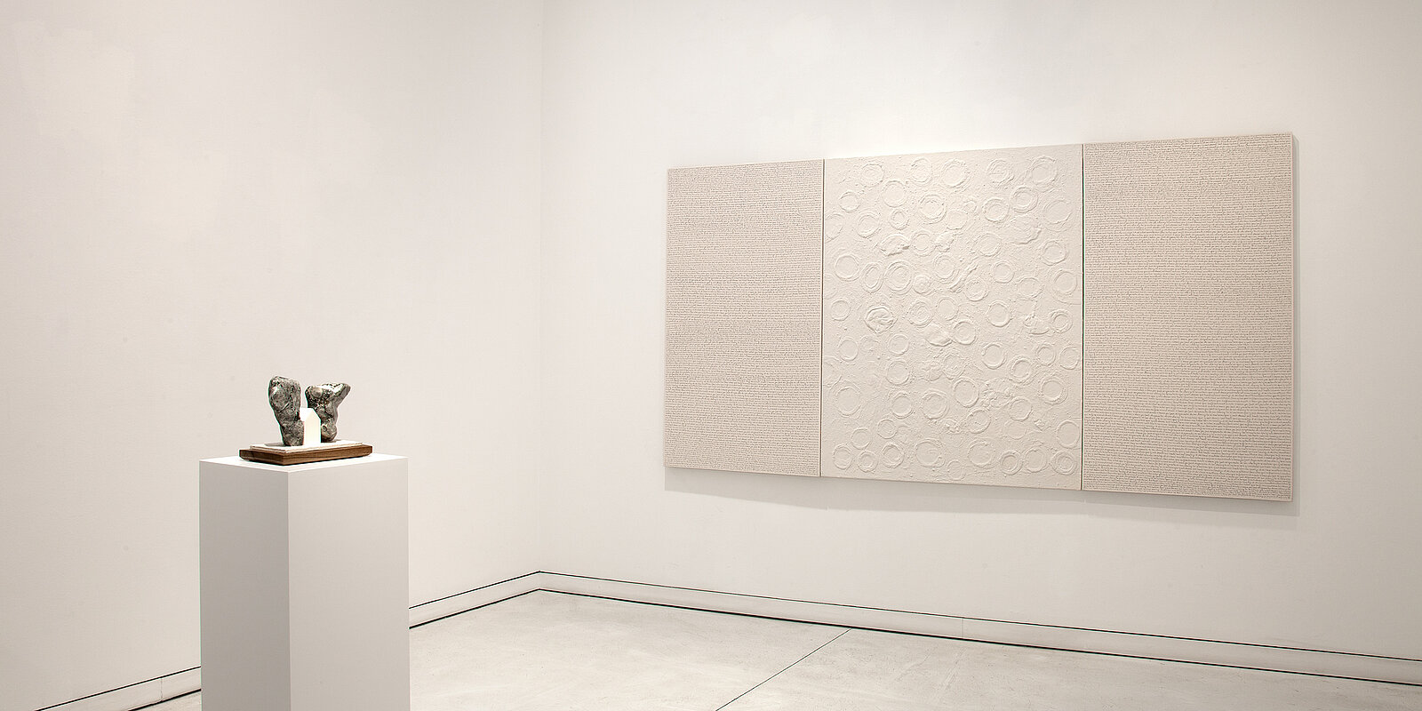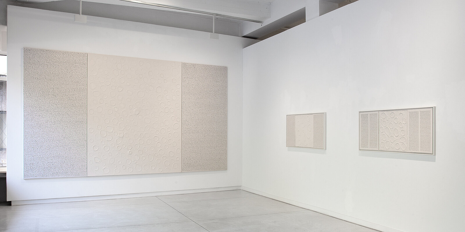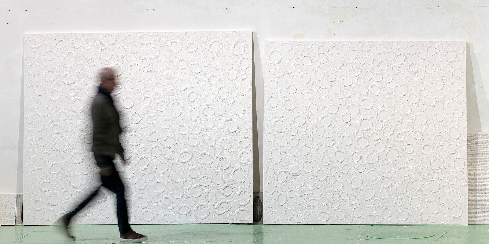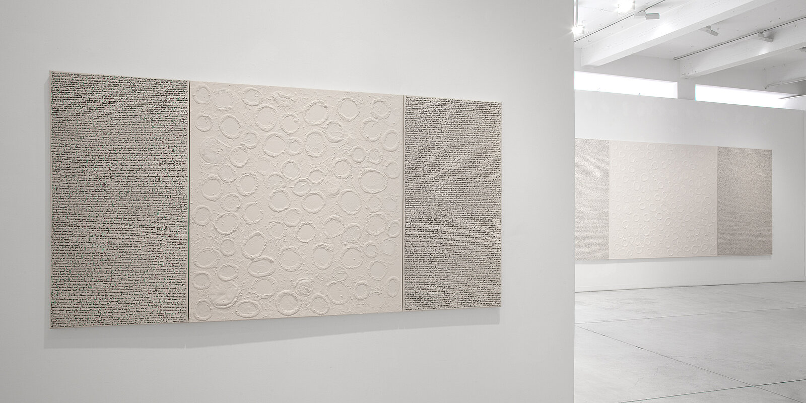 The triptych is Le Groumellec’s favourite display. As the traditional arrangement of Christian altar pieces, it constitutes another reference to the spirituality of the act and experience of painting. The new triptychs with cupules in the centre make the monochrome the main scene. This complete focus on the white forms equals a meditation and turns the paintings into portals to another vision.