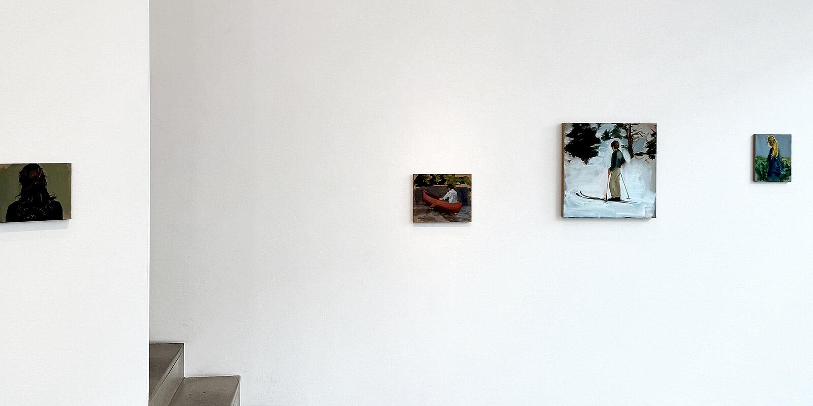 L’œuvre emblématique de l’exposition, Snow Hut (2025), en offre un exemple révélateur. À première vue, se déploie un paysage enneigé silencieux : une petite cabane, le jeu délicat de la lumière et des ombres sur le toit, qui confère vie à la scène. Ce n’est qu’au second regard que l’on découvre de fines traces dans la neige — un détail qui met l’imagination en mouvement et fait naître, presque malgré soi, un sourire. Comme dans ses portraits, le sens émerge ici de l’implicite.
