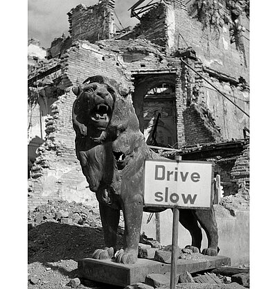 American traffic sign in front of Löwenbräukeller, Munich, Germany 1946