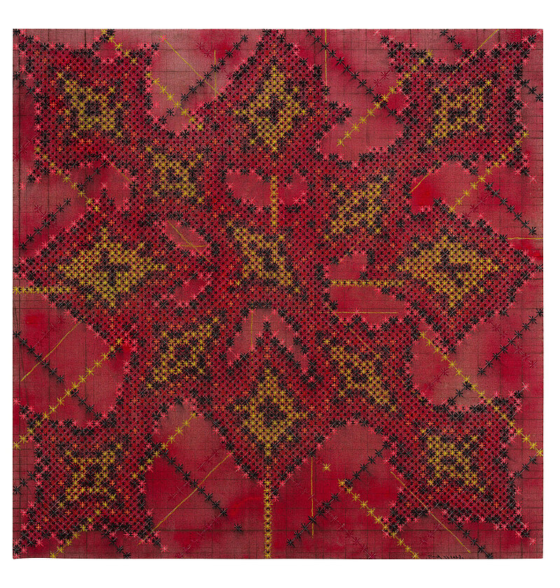Der chinesische Künstler Ding Yi entwickelt seit Anfang der 1980er Jahre komplexe Bildreihen, in denen in immer wieder neuen Variationen und Farben dichter Kreuzstrukturen das Hauptelement bilden. Das Kreuz verweist sowohl auf die Auseinandersetzung mit der traditionellen chinesischen Kultur als auch mit der Malerei der Frühphase des westlichen Modernismus. Ausgehend von den Markierungen in der Herstellung von Druckerzeugnissen wird das Kreuz schließlich als ein „schlichtes, funktionales Zeichen, welches keine spezifischen Interpretationen beinhaltet“, für Ding Yi zum idealen Ausdrucksmittel, um die Abstraktion in der chinesischen Malerei weiter in einen Bereich ohne soziokulturelle Referenzen voranzutreiben. Für den Betrachter entfaltet sich in den zum Teil Wand füllenden Formaten Ding Yis ein vielschichtiges Wechselspiel der Formen und Farben.